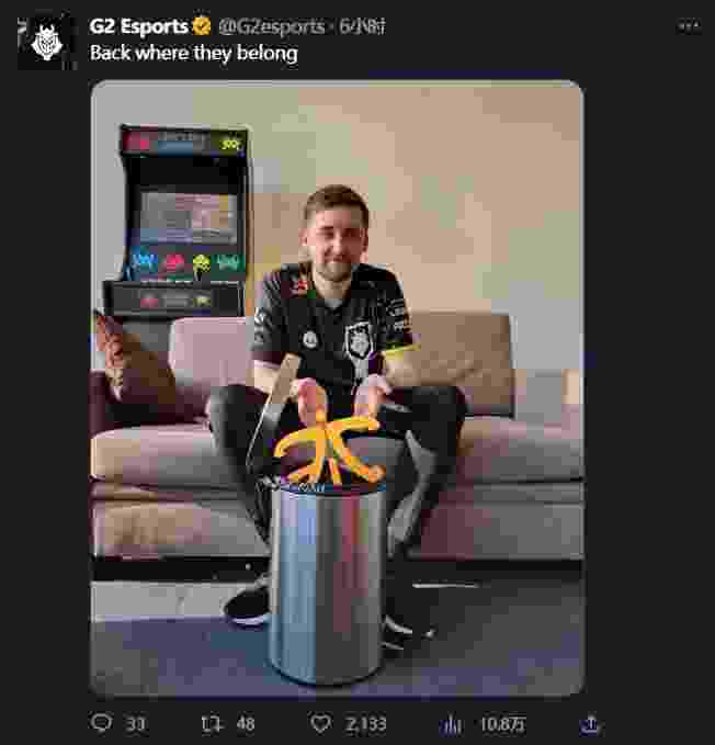 而G2官方推特则放出了一张整活照片,HooXi把fnatic LOGO扔进了垃圾桶之中。并且配字:回归他们的本来位置~
