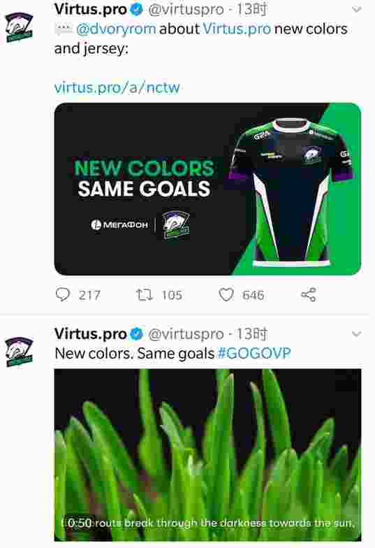 很多粉丝担心是否以后的贴纸也会是这个配色,官方表态新队服的配色变化仅限2018年,并不会适用于下届Major的贴纸上,并将在今年年底为Virtus.pro推出全新的LOGO。就在昨天,VP官方Twitter发表了一个短视频,并配文称:New look. 15 days to go (新外观,还剩15天)。