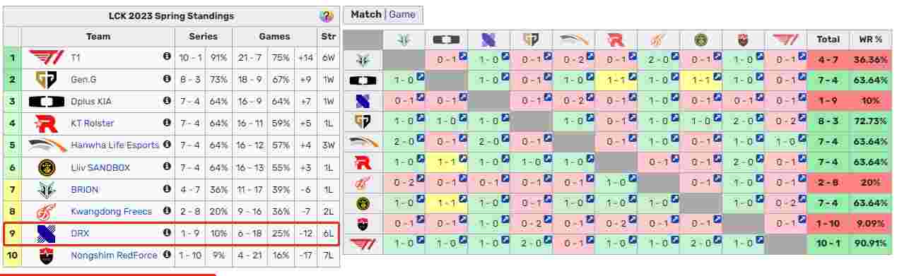 北京时间2月24日,2023LCK春季赛结束了GEN与DRX的对局,DRX也是不出意料0:2输给GEN,在S12夺得全球总冠军之后DRX历经人员变动,战队迅速萎靡,在LCK联赛里只有1胜10负,排名倒数第二。