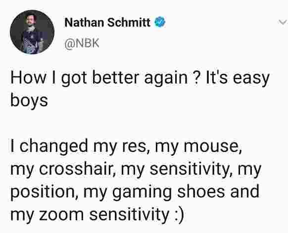 对于自己最近状态爆棚,NBK也在推上表示:“很简单,我改了分辨率,换了鼠标,改了准心、灵敏度等等......”