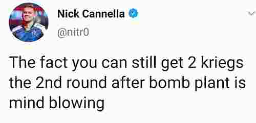 Liquid的nitr0也在抱怨,即便输了手枪局只要下了包就能有2把sg 553用这种情况实在太令人头疼了。的确,我们现在能看到为了阻止T方下包,更多的职业队选择手枪局前压防守,宁愿输掉也不想让对手下包。希望SG削弱的那一天快点到来,也许当那一天真的到来将会是这样......