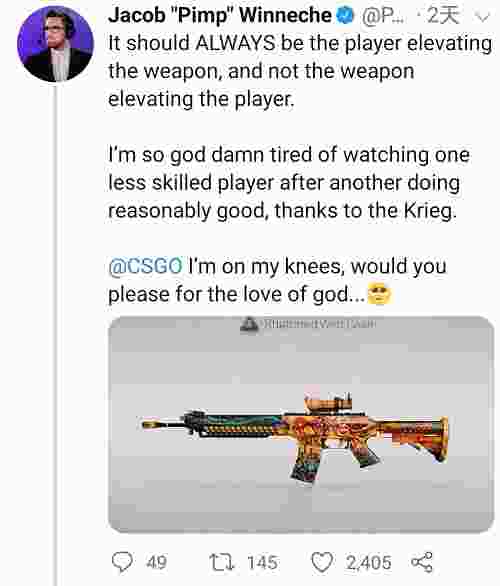 Niko的回答大概是:“这把枪太强了,能当狙用,比狙好使,菜鸟变强,不削怎么玩”之前的GO圈我们也提到过NiKo在CSGO官方推特下方孜孜不倦留言敦促V社削弱SG的消息。社区对待这把枪也是削弱的呼声更多,分析师Pimp也在推上PO出了自己的看法。