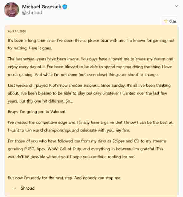4月1日,前Cloud9职业选手shroud推特发表一则声明,表示自己经过一段时间Valorant的游玩决定重新加入职业舞台征战新游!这种假的不能再假的愚人节玩笑还真钓到一条大鱼。