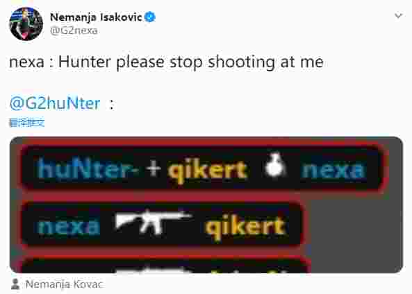 比赛中huNter又又又又TK了nexa,赛后nexa也是在推特上调侃:“当我跟huNter说不要再向我开火了,而他......”