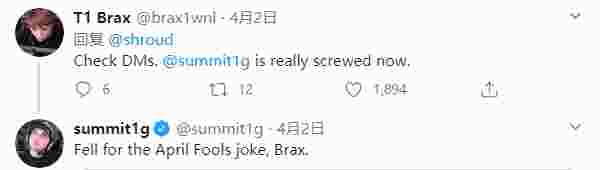 前一段时间刚转Valorant不久的swag看到这则声明十分兴奋,表示:“哥们快看你私信!”summit1g则表示:“你还是太年轻了,这只是一个玩笑罢了。”