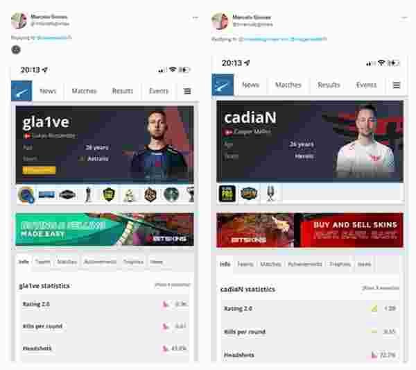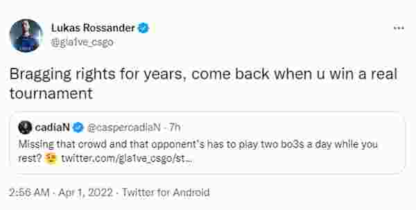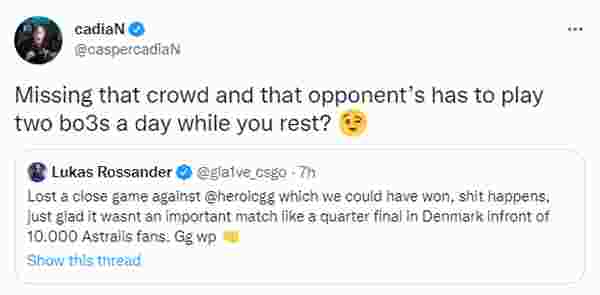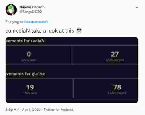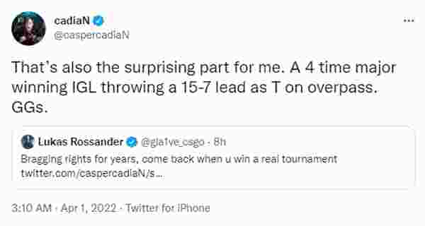 昨日EPL S15小组赛Heroic以2-1击败Astralis,然而在赛后cadiaN与gla1ve在推特上直接开始文斗环节,哥们直接第一时间到场吃瓜。