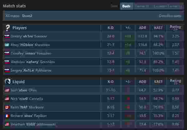 在周一结束的Gambit对阵Liquid的比赛中,图一红星在沙二上以16-1的比分暴打Liquid,而赛后EliGE的rating仅为0.06,KD为1-17。