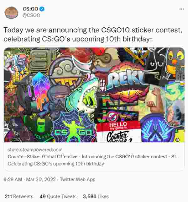 本周三CSGO官推突然诈尸宣布为庆祝即将到来的CSGO 10周年纪念日,正式开展十周年贴纸征集活动。这到底是v社真准备开始好好筹备了,还是新的偷懒方式?一起来看看国外网友怎么说。