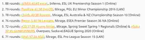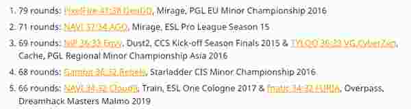 不过在顶级赛事中他们还是打破了NIP与Envy所保持的记录,这两队在2015年的CCS Kick-off Season Final中整整打了69回合,当时的这场赛事含金量十足,TSM、NIP、Envy以及fnatic都在其中,所以也被定级为S级赛事。而在七年之后,NaVi与AGO成功创下新高。