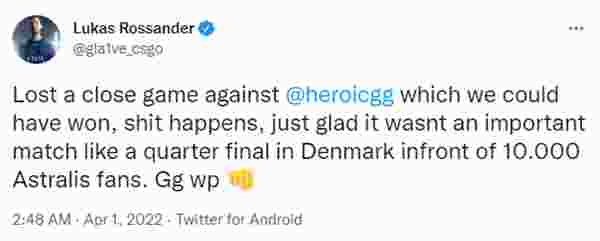 gla1ve先是在赛后发了条推文:很可惜我们输掉了这场相当接近的比赛,但幸好这并不是什么重要比赛,比如在一万名A队粉丝面前的丹麦主场四分之一决赛这种。