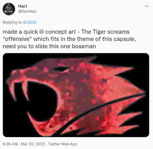 推特用户Haci:我自己做了一个概念图,主要样式是一个咆哮状的狮子在呼喊着“进攻(offensive)”,这非常符合我们CSGO的这个主题,就看你答应不答应了老大。