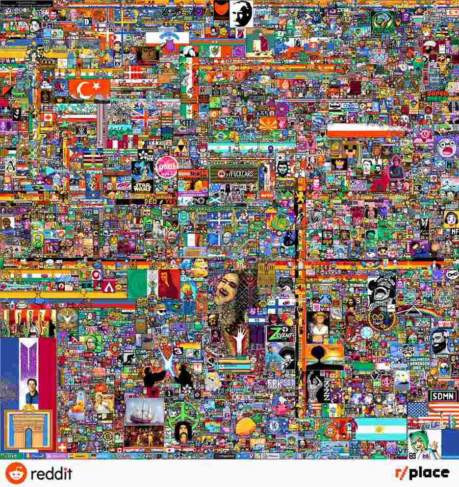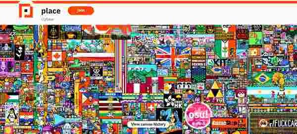 时隔五年,reddit社区再次推出愚人节r/place像素画活动,网站提供了一个巨大的白色公共数字画布,每个用户每五分钟可以在一个像素格中填充颜色,这项活动非常考验团队合作,如果想要完成一个完整的图案必须要一个群体有组织的进行颜色填充,同时也要小心那些喜欢搞破坏的捣蛋鬼用户,他们会故意整活破坏原本的图块。