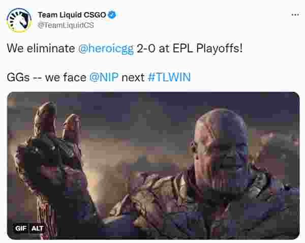 然而在两个小时后,美国队长2-0爆杀丹麦超英联盟,Liquid也是用灭霸打响指的图来回应臊皮的Heroic。