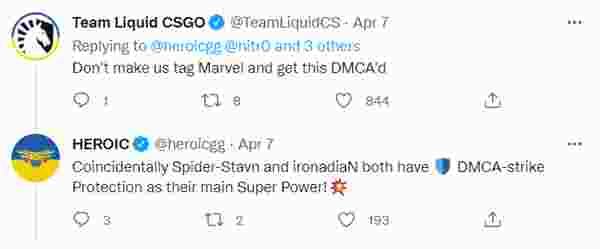 Heroic疯狂调侃Liquid,一张图上全身是梗,Liquid官推回复:小心我把漫威官方艾特过来告你们侵权。Heroic仍不忘整活:鉴于Spider-Stavn与IronadiaN反侵权保护系统就是他们的超能力,所以你们这招对我无效!