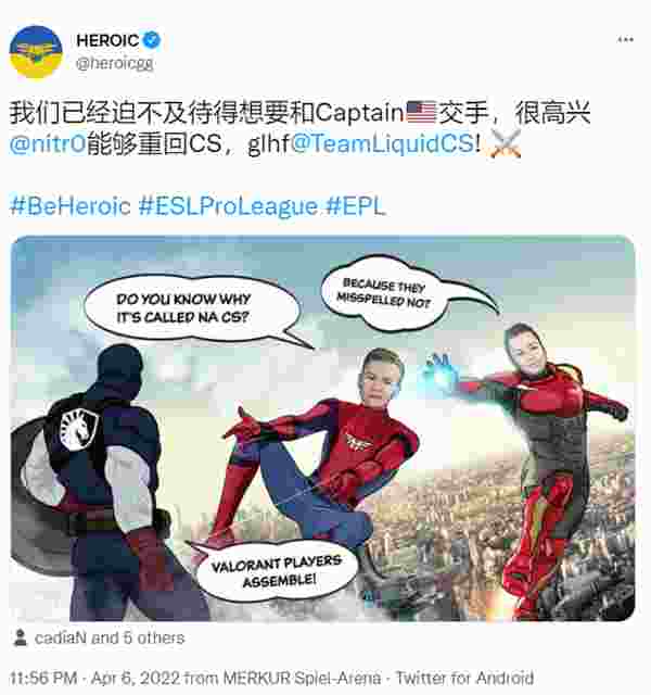 4月7日晚NACS独苗Liquid在淘汰赛中与Heroic相遇,丹麦俱乐部依然是整活力度拉满,赛前放出搞笑P图,Spider-Stavn与IronadiaN对抗美国队长Liquid。