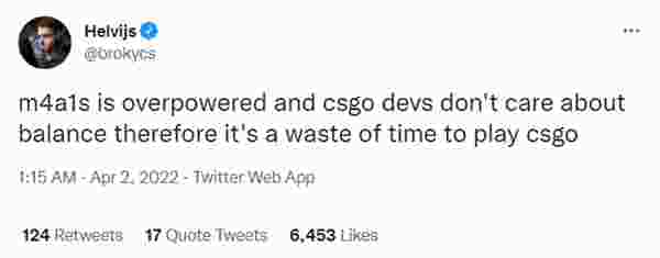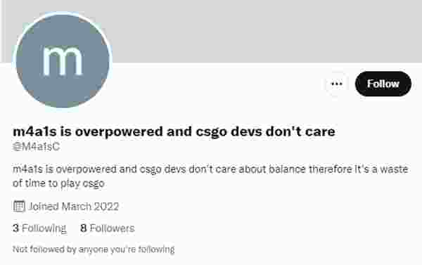 自上次M4A1-s加强以来,越来越多的人意识到了这把枪的恐怖之处,职业哥们也更多的开始选择A1而不是A4,甚至路人局中也鲜有见到有人配A4。三月份推特上开始出现了一位ID为m4a1s is overpowered and csgo devs don't care(m4a1-s被过于加强了,然而csgo的开发者根本就不关心游戏平衡的问题)的用户,他的个人简介也是相同的内容。