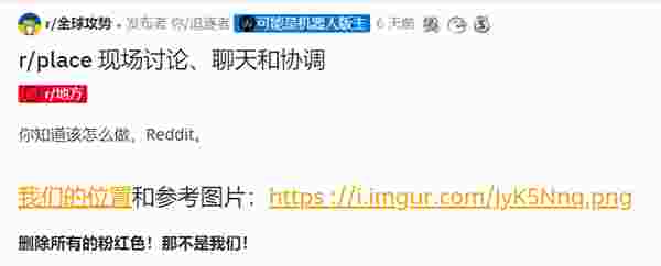 CSGO板块也在第一时间加入到这场活动中,版主特别立帖制定作战计划,给出了CSGO板块在画布上的位置后,确认最终目标图片,并且要特别注意那些涂粉色的家伙(记住这句话,等会儿要考)。