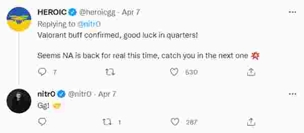 Heroic在nitr0的推文下表示原来打瓦还真有buff加成,并且也祝他们在接下来的比赛中一帆风顺。