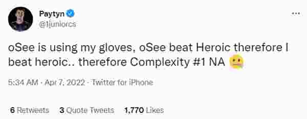 Junior:oSee用我的手套打赢了Heroic == 我打赢了Heroic == Complexity是NA Top 1。