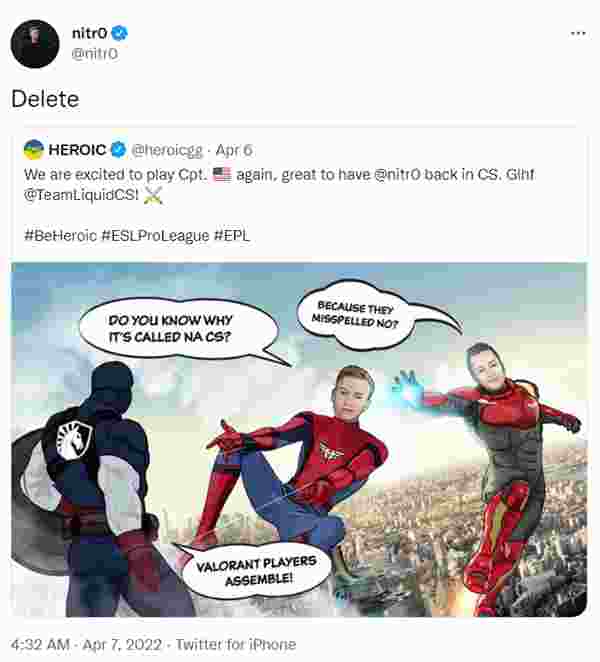 nitr0在赛后仅用‘delete’这一个单词回应了Heroic:删掉,删掉,一定要删掉