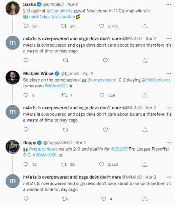 从3月25日开始,这名用户在各大CSGO选手以及战队的推文下回复:m4a1-s被过于加强了,然而csgo的开发者根本就不关心游戏平衡的问题,继续打csgo简直就是浪费时间。(m4a1s is overpowered and csgo devs don't care about balance therefore it's a waste of time to play csgo)目前他的回复没有上千也有几百条。
