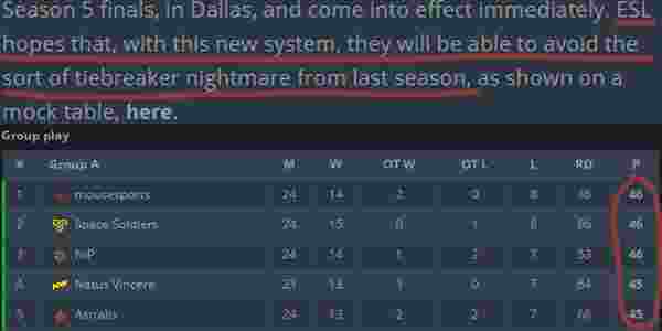 常年被国外水友们疯狂调侃的ESL,最近又犯错啦!在早些年的EPL北美和欧洲线上赛中多次因为队伍胜负关系和积分问题,导致最终排名和出现情况受影响,最经典的当属S5赛季同分的G2和HR的事件,净胜局低的G2保住了第十三的保级名额,反而仅仅因为之前0-2输给G2的HR掉入了EPL升降级赛。