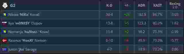 半场30-4,3.03的Rating,澳龙哥直接笑嘻嘻的在家里开始挂机,不过这对于G2来说也仅仅是昙花一现,正当铁子们觉得尼公子今天要爆种,二三图尼公子瞬间掉回普通形态,好在数据都维持在队伍中游,也帮助G2以2-1的比分成功拿下教父。