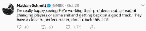 法国梦之队领袖NBK也发推恭喜了FaZe终于拿到了一个好的成绩,不过Twitter内容实在有种指桑骂槐的味道,简单来说就是客套的说一下恭喜FaZe喜提冠军奖杯,实际上醉翁之意不在酒表达FaZe的夺冠可不是通过瞎鸡掰换阵容等手段成功的,不要试图去尝试这些shit...这就让人产生了无限遐想,他是在暗示法国兄弟战队G2呢,还是表达老男孩梦之队Vitality永结同心?