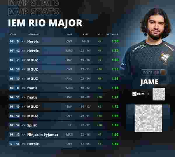 随着IEM里约Major总决赛落下帷幕,Outsiders在总决赛中2-0击败Heroic。HLTV也随之公布了本届MVP选手。Jame凭借整届赛事稳定的发挥和出色的带队能力成功获得该枚MVP奖章。