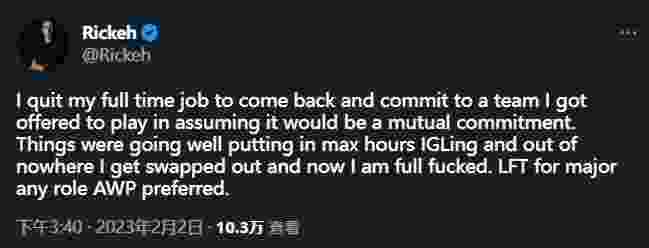 今年二月初,现年31岁的Rickeh表示自己已经辞掉了工作,以便于全身心的投入新战队之中。但没想到他突然成为了战队阵容调整的“牺牲品”,之后他用了一个月的时间寻找新战队,Rickeh在推特中也表示可以打任何位置,狙击手优先。遗憾的是没有任何下文,他已经走投无路了。