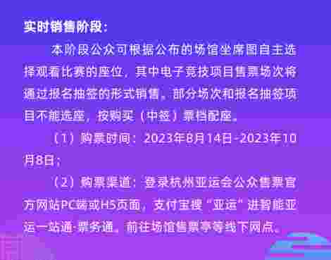 在公众购票指南中可以看到,电子竞技项目售票场次将通过报名抽签的形式销售,且不能选座,按中签票档配座。