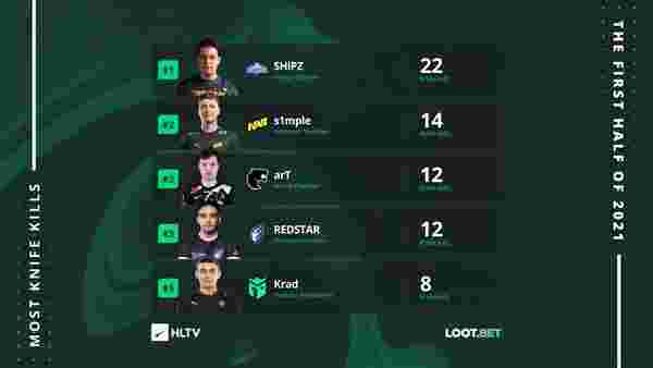 今日,HLTV公布了上半年世界排名前三十队伍选手的刀人情况。保加利亚战队SKADE的SHiPZ以22个人头占据榜首,s1mple位列第二,不过乌克兰剑圣打的大图张数要比SHiPZ少一半还多(278:126)。