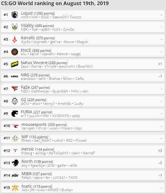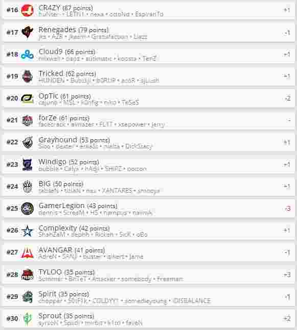以下为HLTV战队积分榜: