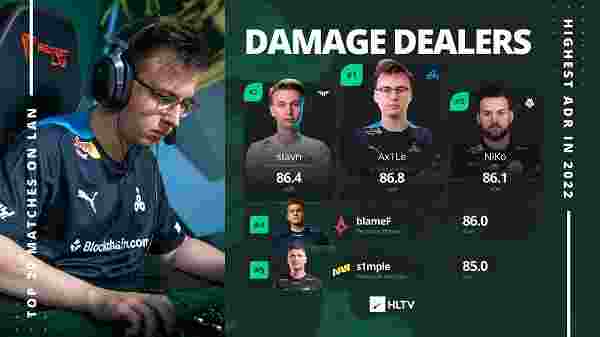 HLTV发布数据显示,来自C9的选手Ax1Le每局平均造成伤害为86.8,领先于Heroic的stavn(86.4)、G2的NiKo(86.1),成为了2022上半年的ADR之最。