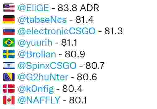 位列第四名的是来自Astralis的blameF(86.0),s1mple则以85.0的ADR排在第五名,成为了唯一上榜的狙击手。