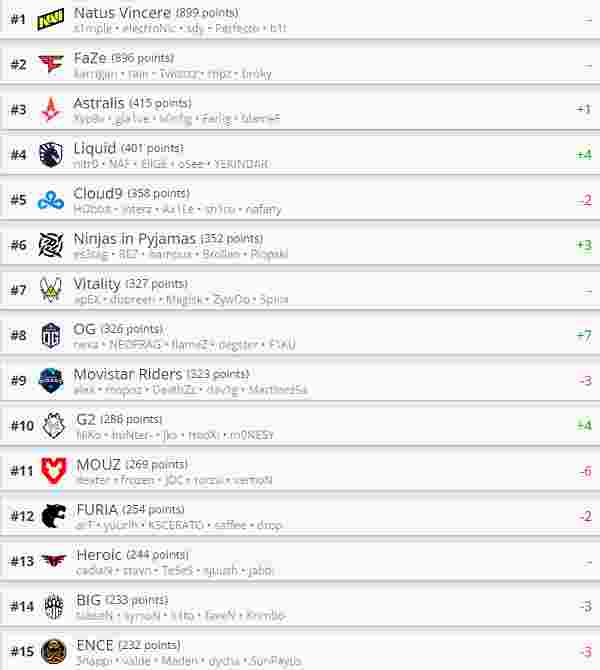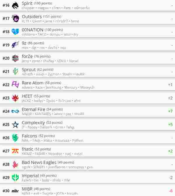 前十名当中进步的还有NIP、OG和G2战队。目前G2战队成为前十守门员。11-20名当中退步最大的是MOUZ战队,排名下滑六名。BIG和ENCE战队排名也各自下滑三名。21-30名中Rare Atom战队排名来到第22名,Eternal Fire排名上升七个位次变为第24名。