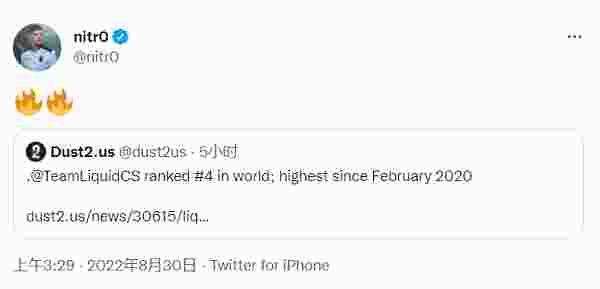 Liquid队员对排名相当满意,这也是自2020年2月以来Liquid战队的最高世界排名,看来YEKINDAR正是Liquid的最后一块正确拼图。除了nitr0之外,EliGE也非常激动:刚回家就看到这个好消息。对于我们目前的成果很满意,继续努力!!!