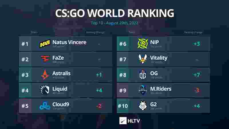 伴随着BLAST Premier 2022秋季小组赛正式结束,HLTV也更新了世界排名。凭借着在小组赛上的出色发挥,Liquid和OG战队排名上扬,Liquid位列第四名,OG战队来到第八名。