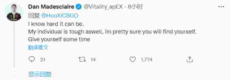 而在评论区中,Vitality指挥apEX也暖心安慰:我知道这有多难。我的个人竞技水平也很糟糕。给自己一些时间,我相信你能找到真正的自己。