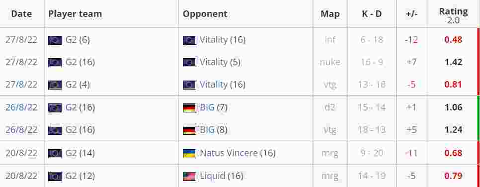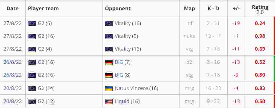 在今天凌晨备受瞩目的G2对阵Vitality战队的比赛里,G2遗憾1-2不敌Vitality。而从赛后选手个人数据来看,G2指挥HooXi的数据确实有些辣眼睛:21杀50死,0.62的rating,47.1的ADR。