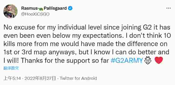 而就在结束同Vitality比赛之后,HooXi在个人推特上谈到了自己最近的表现:对于我加入G2以来的个人竞技水平没有任何借口,实际表现甚至低于我的预期。虽然我并不觉得多拿10+个人头真的能够改变图一或者图三的局势,但我知道我能够做的更好,我也会这么做的。感谢大家一路以来的支持!