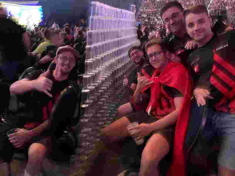 现场观众用塑料啤酒杯摆出了德国特色的酒杯墙(BNE粉丝会整活)