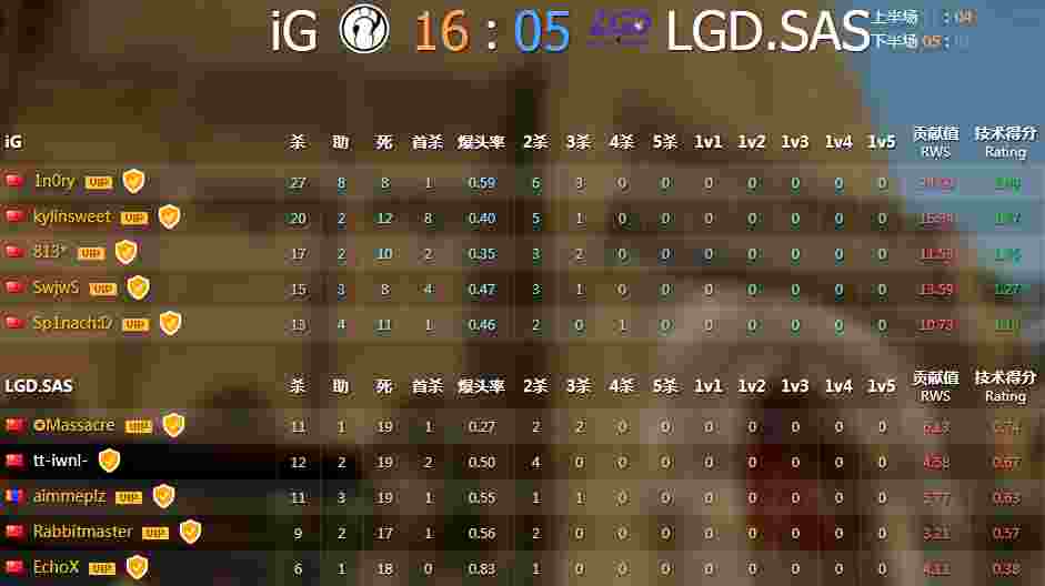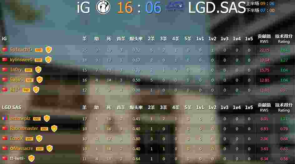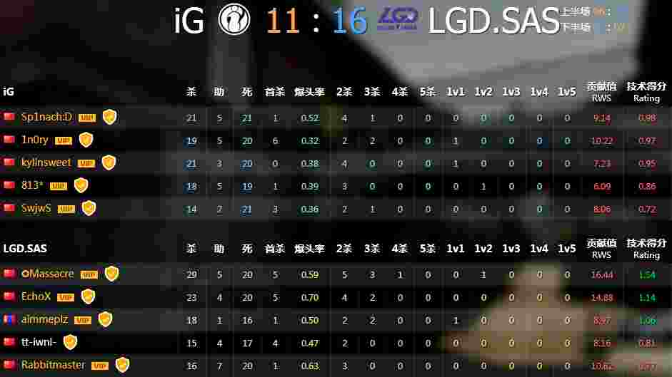拼刀局选边IG获胜,选择了CT防守方,LGD.SAS为T进攻方,第一局手枪局IG 1穿2成功拿下了第一局,第三局IG的Sp2nach:D更是凭借一波四杀刷屏表现亮眼,IG在上半场其实如虹,丝毫没有给LGD.SAS喘息的机会,一度将比分拉开到了 8:1,虽然LGD顽强抵抗,但是IG最终还是将上半场的比分锁定在了11:4,下半场手枪局IG轻松拿下,随后凭借战队的出色发挥,以16:5成功拿下第三局;