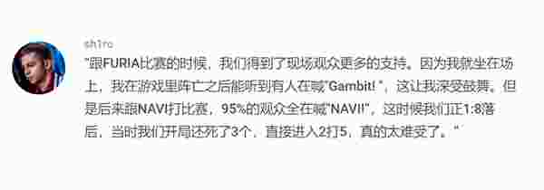 总体而言,sh1ro在观看视频的粉丝朋友们面前对这场major的体验进行了积极评价。sh1ro表示希望未来Gambit能有更多机会在这样的条件下发挥。