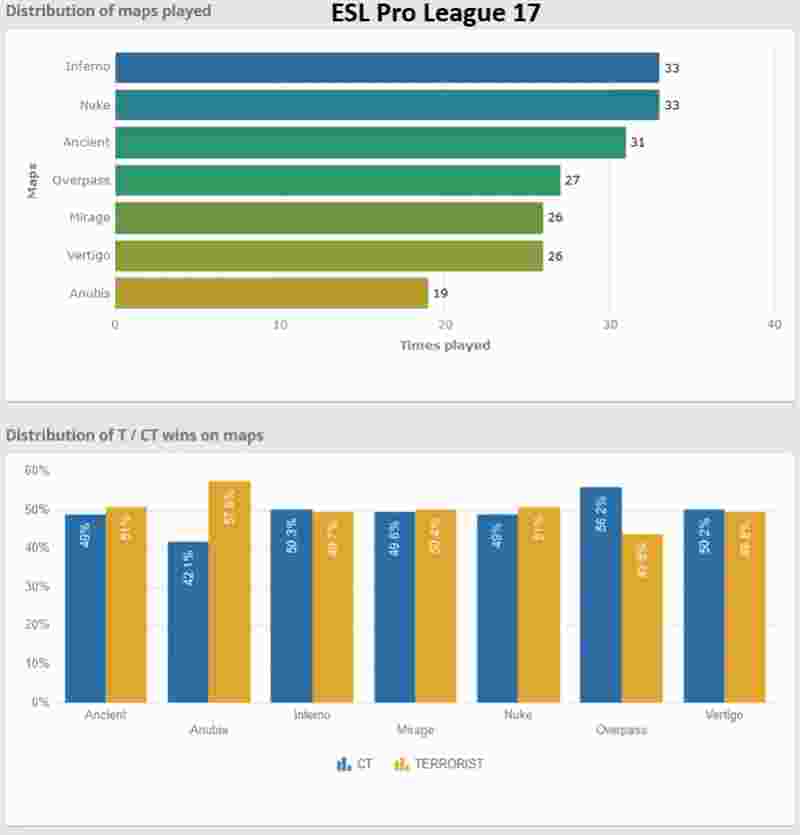 EPL S17已经告一段落,有关地图的各项数据也都出炉。相比于EPL S16,EPL S17的赛程显然更长,而各个战队对于地图的选择显然更加丰富和合理。首先Inferno仍旧深受大家的喜爱,以33次位居榜首,Nuke和Ancient也后来追上,大家对于Anubis这场地图仍旧有忌惮,选择的次数并不多。