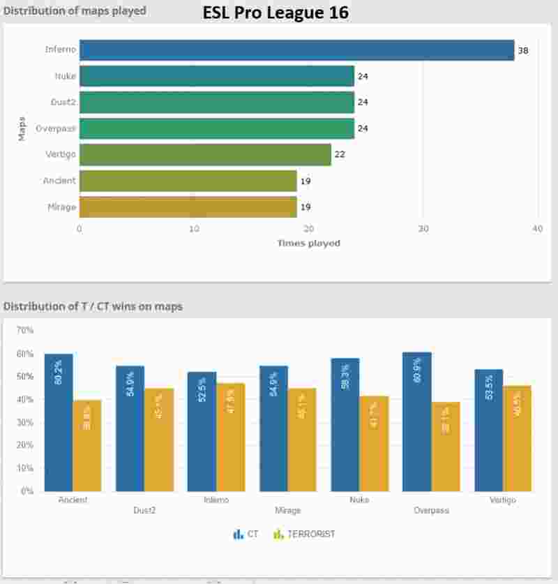 而在地图胜率方面,我们明显能够看到,跟EPL S16全部为CT图不同,经过半年的多次地图枪械修改和战术开发之后,大部分服役地图已经趋于平衡,CT/T方胜率五五开,但有两张地图还是有很明显的不平衡倾向。