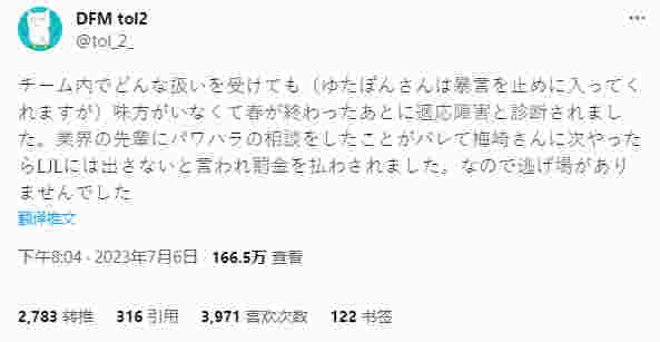 不管我在队伍中遭到什么样的威胁,都没有人伸出援手(虽然 Yutapon 会阻止言语谩骂)。春季赛结束后,我被诊断出患有适应障碍症。当我向业界的前辈求援时,消息传出去了,梅崎先生跟我说,如果我再这么做的话,我将被禁止参加 LJL 比赛,并被迫支付罚款,因此我没有逃脱的机会。(注:梅崎是 DFM 的 CEO)