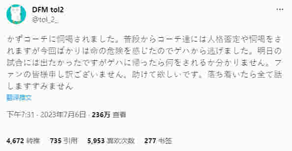 “我被 Kazu 教练威胁了。虽然我经常被教练们贬低和恐吓,但这次我感受到了生命受到威胁,所以我逃离了战队屋。我原本想参加明天的比赛,但我不知道我回去后会发生什么。对于粉丝们,我感到十分抱歉,请帮帮我吧。等我冷静下来后,我会将一切都告诉你们的。抱歉。