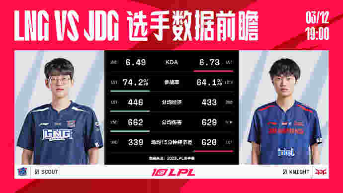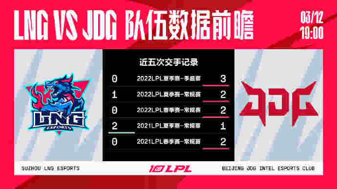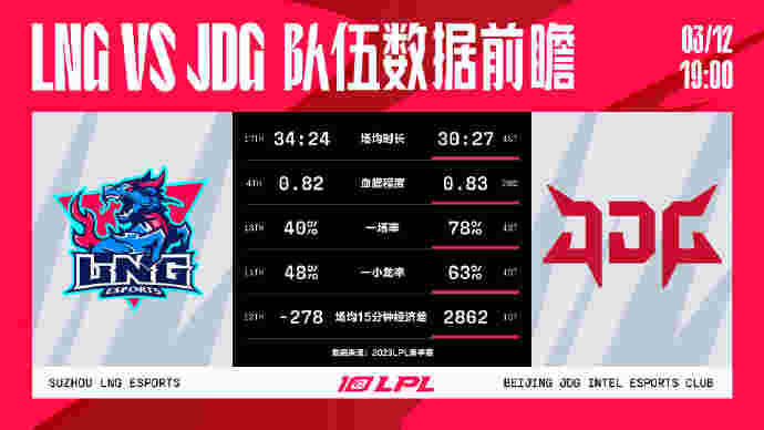 北京时间3月12日,2023LPL春季赛将迎来焦点大战LNG VS JDG,下面是LPL官方给出的数据前瞻。