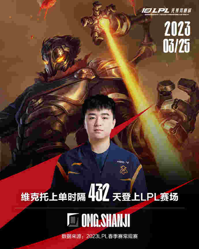 北京时间3月25日,2023LPL春季赛OMG与BLG的决胜局,OMG上单shanji选出了上单维克托,这也是维克托在上单位时隔432的登场!
